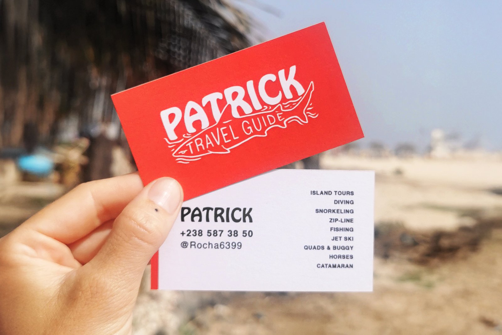 Patrick Rocha is a travel guide based on Sal, one of the islands in the Cape Verde archipelago off the west coast of Africa. He works with tourists visiting the island, helping them book activities — island tours, diving, snorkelling, fishing, jet skiing, zip-lining, quad and buggy rides, horseback riding, and catamaran trips. Most of his clients find him on the ground, through word of mouth or by picking up his card at local spots.